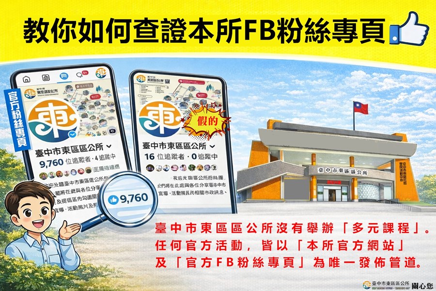 【 緊急澄清:請認明東區公所唯一官方粉專!】 臺中市東區區公所 2025-12-22 近日發現有不法人士偽冒「臺中市東區區公所」名義開設假粉專,並發布不實課程招生資訊。 請各位鄉親朋友提高警覺,切勿點擊不明連結,以免個人資料外洩或遭受詐騙! 詐騙網頁特徵: 剛成立、粉絲人數極少。 要求加入私人的 LINE 群組。 提供非政府網址(.gov.tw)的報名連結。 正確資訊請認明: 本所官方網站: https://www.east.taichung.gov.tw/ 本所唯一...