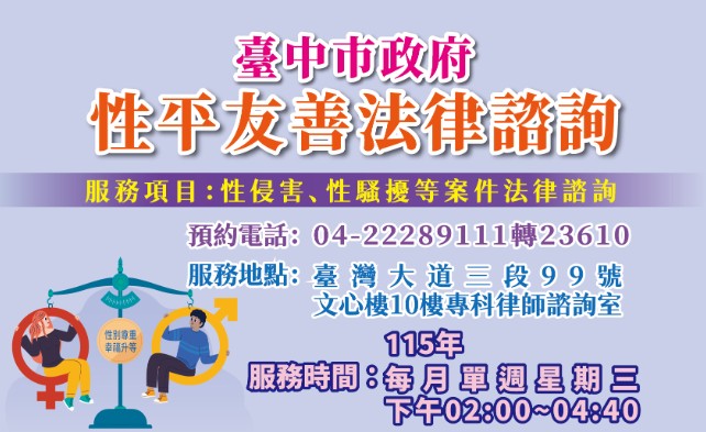 律師團隊由臺中市政府法律扶助顧問、社團法人臺中律師公會、財團法人法律扶助基金會臺中分會、臺中市政府家庭暴力及性侵害防治中心推薦的性平專業律師,及財團法人犯罪被害人保護協會臺灣臺中分會合作組成,服務時間為:每月單週星期三下午2:004:40進駐中市府專科法律諮詢室,提供現場法律諮詢服務;如有相關需求,可撥打預約專線:04-2228911123610,並歡迎至法制局現場洽詢律師。