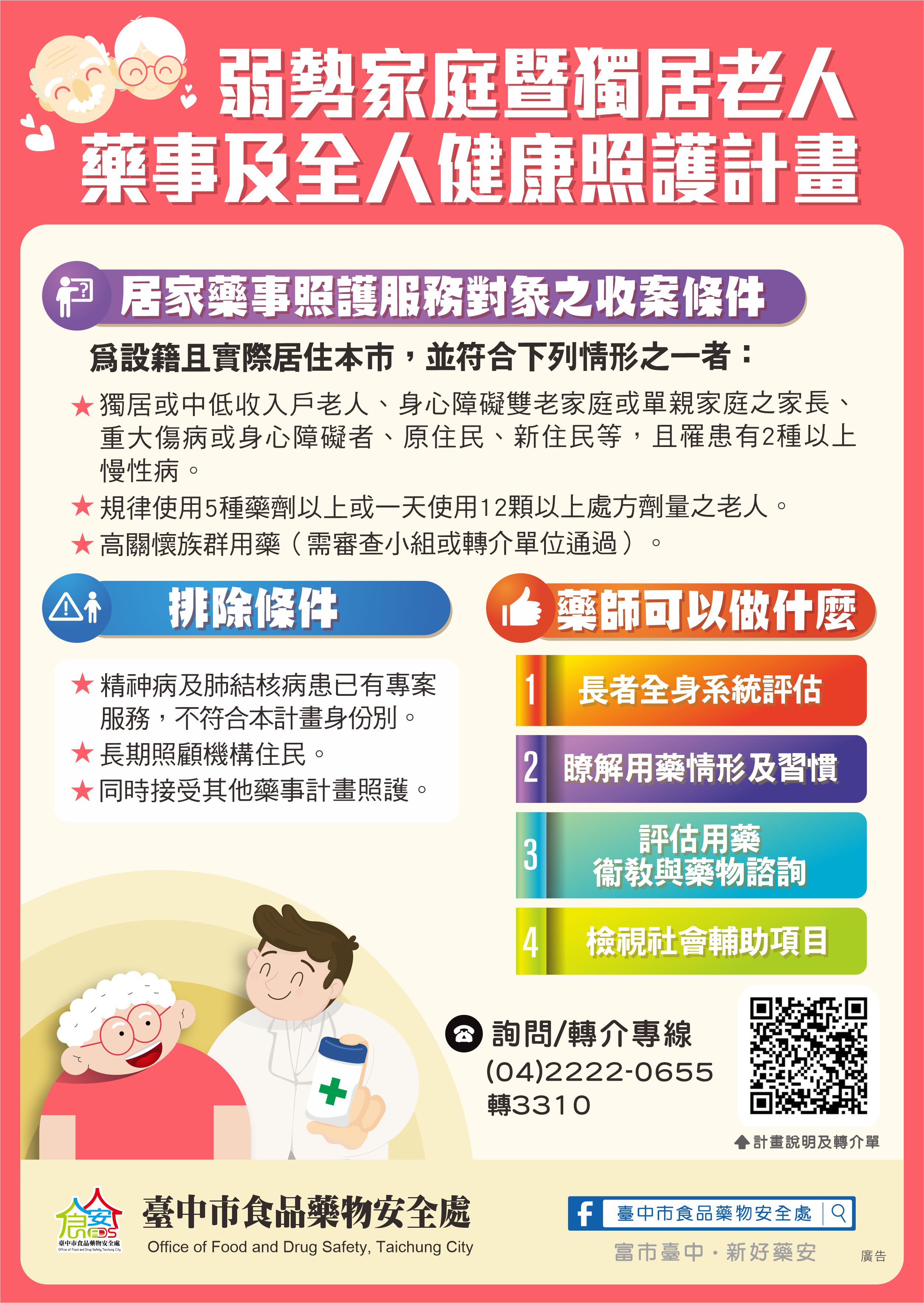 臺中市食品藥物安全處「弱勢家庭暨獨居老人藥事及全人健康照護計畫」宣傳單