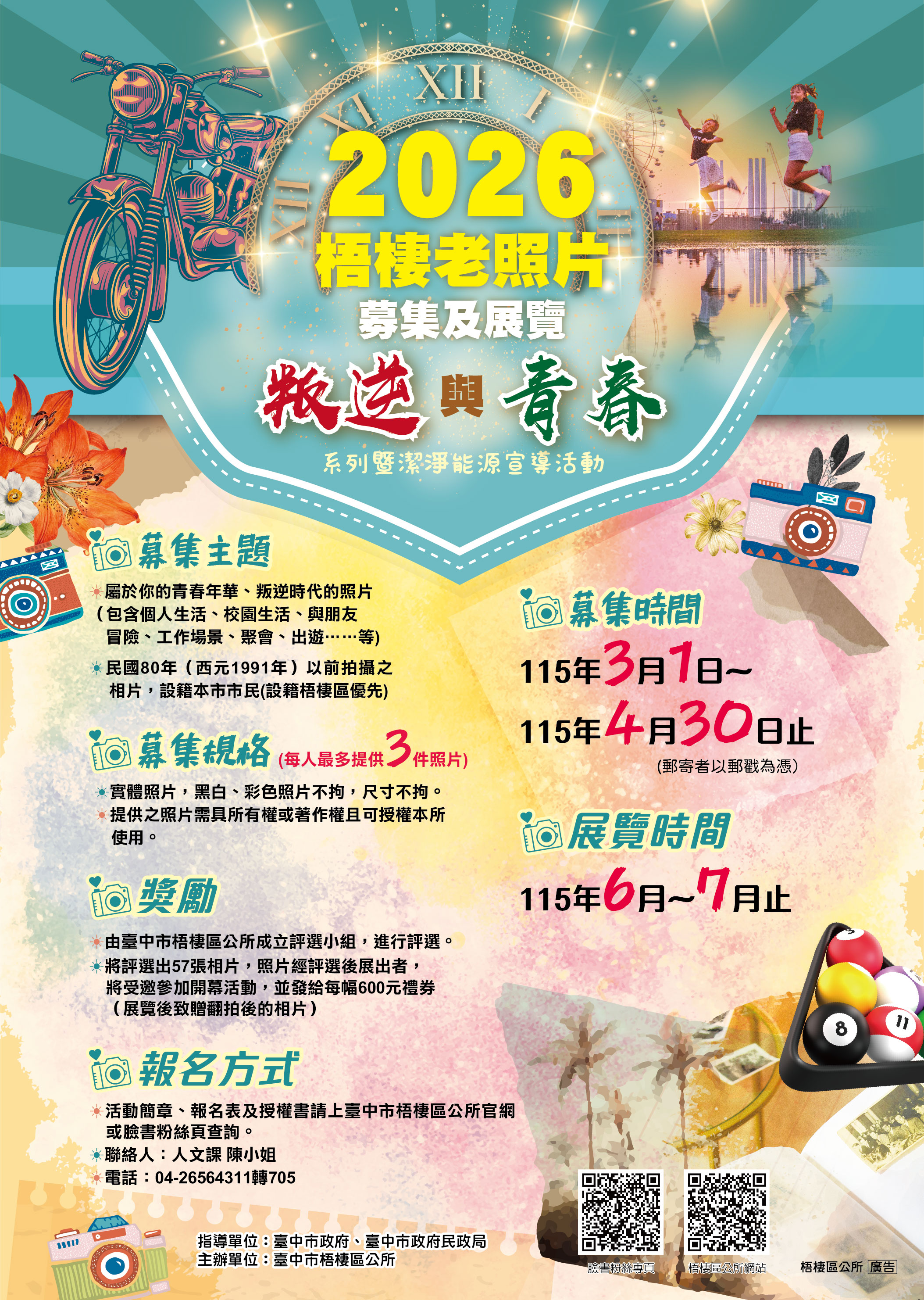 一、 旨揭活動為該所「梧棲藝文季」系列活動之一,以提倡優質休閒旅遊活動及發展在地觀光產業,為讓大家認識梧棲早期的精采故事,特辦理梧棲區叛逆與青春系列照片募集及展覽活動,希望藉由照片中故事,喚起民眾記中甜蜜美好的回憶與共鳴。