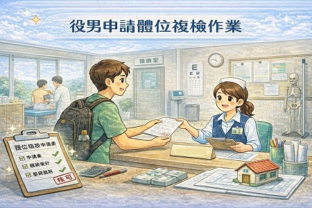 役男體位複檢申請辦理 役男對體位判定結果如有疑義,得依規定申請變更體位複檢。 申請資格、應備文件及辦理方式,請參閱一次告知單或相關說明文件。本頁面提供申請導引與服務窗口資訊,實際申請內容以臺中市政府公告為準。洽詢電話:本所人文課 (04)2215-1988 分機302